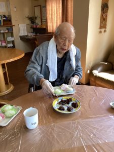 今日は春の陽気に誘われて、入居者の皆さんと一緒に牡丹餅作りを楽しみました。