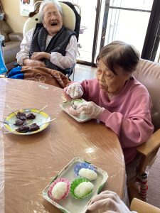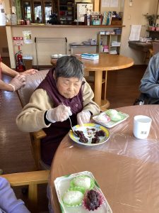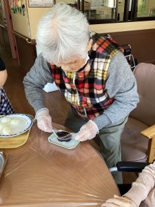 今日は春の陽気に誘われて、入居者の皆さんと一緒に牡丹餅作りを楽しみました。